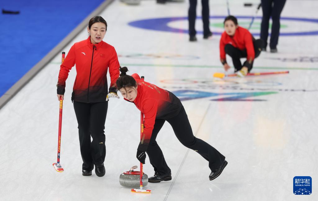 2月18日,中国队选手姜嘉怡(中)在比赛中掷壶。