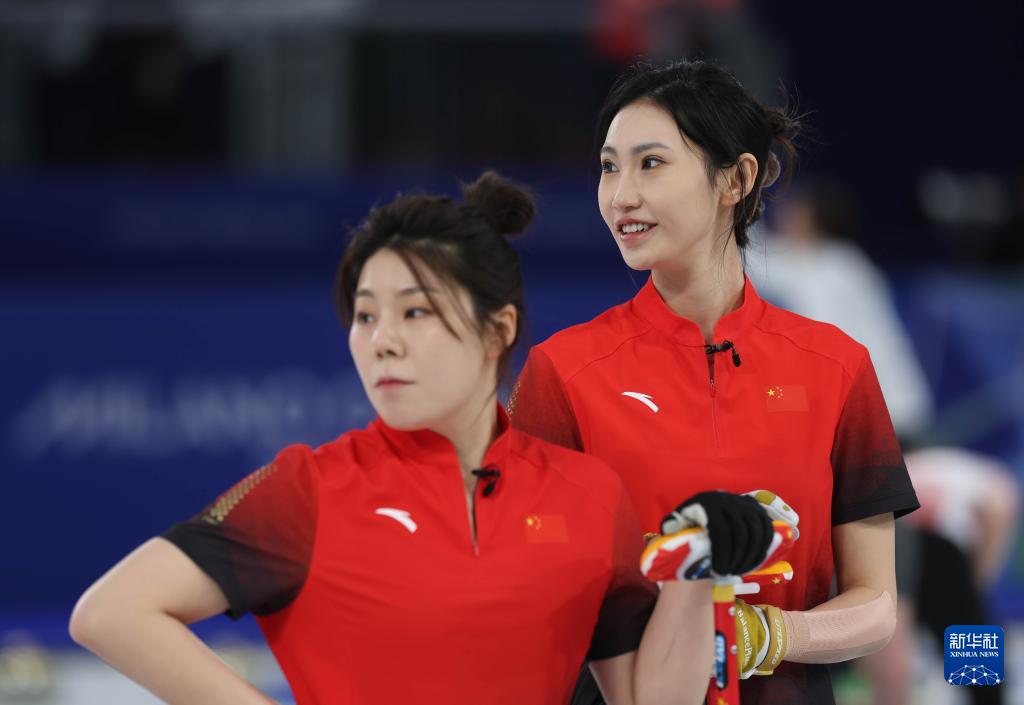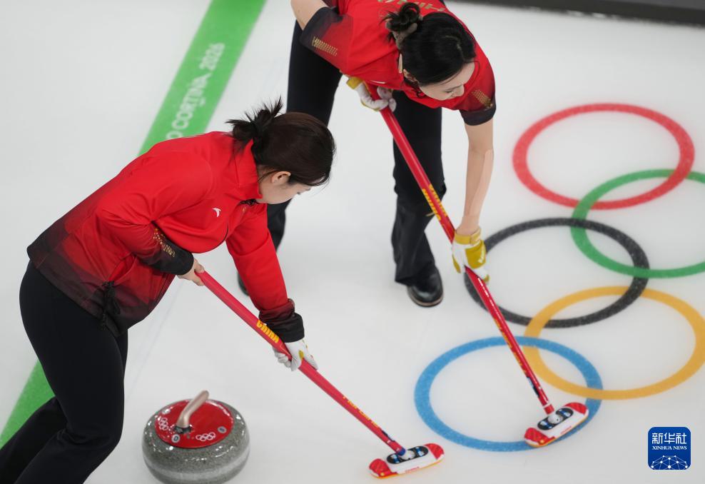2月18日,中国队选手董子齐(右)在比赛中掷壶。